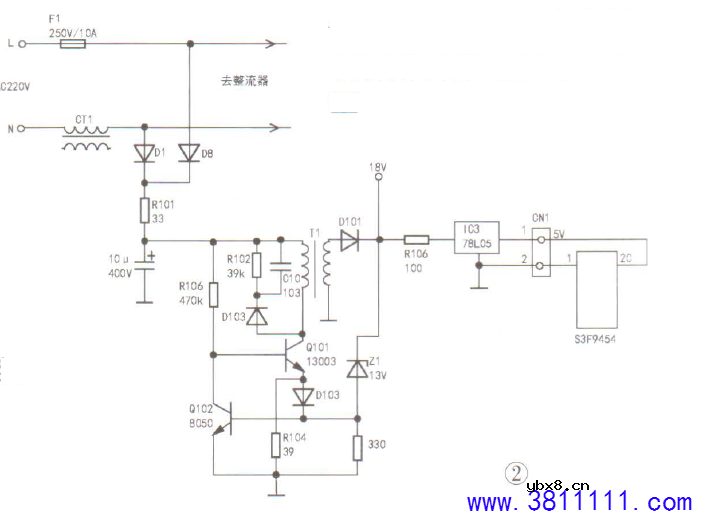 例2: 一台万家乐MC一18E 电磁炉,上电后无 任何反应。 分析检修:拆机目测,发现10μF/400V 滤波 电容已炸开,保险管F1 巳熔断;在路检测,发现整 流二极管D1 断路、D8 短路,限流电阻R1 01 断 路。更换上述损坏件后加电,机器无上电"滴"音。 测低压电源18V 正常,但5V 电压偏低至2. 6V。测 三端稳压块IC3( 78L05) 的限流电阻R106 正常, 更换IC3 无果。断开灯板与主板相连的排线后5V 电压正常,由此判断故障在灯板。转向检查灯板, 当断开单片机(S3F9454 )供电端20脚时, 5V 电压 正常。断电检测,发现单片机20脚对地阻值很小, 判断单片机损坏。网购灯板(软件版本号为 。MC16A一V2.1 ),换上后试机, 故障排除。相关电路如图2 所示。 |
