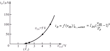 (1) 增强型NMOS管的转移特性:在一定VDS下,栅-源电压VGS与漏极电流iD之间的关系: