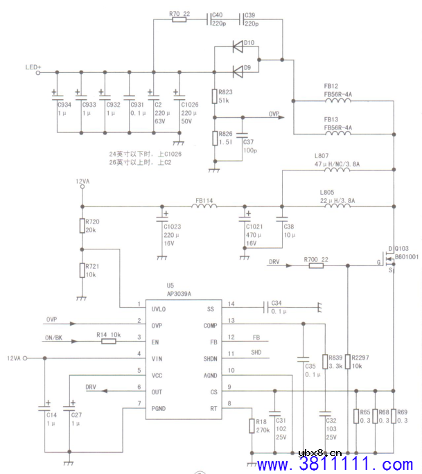 海尔LD32U3100型液晶彩电黑屏故障检修 一台海尔LD32U3100型液晶彩电二次开机后黑屏,但伴音正常。 试机,发现背光不亮,屏.上有暗波的图像。本机采用三合一主板( 板号:NSTV2409 -ZC01-01),主芯片是MSTV59,背光恒流控制芯片采用 AP3608E,背光升压控制芯片采用AP3039A(U5),相关电路如图1所示。二次开机后,测得升压整流二极管D9、D10负极电压一直为12V,说明升压电路未工作。转向检测U5的工作条件,测得U5③脚(EN)的背光开启电压为5.2V,④脚电压为12V,⑤脚(内部输出)电压为12V,①脚(低压保护)电压为4.41V,②脚(OVP保护输入)电压为0.3V,均正常,但⑥脚(脉宽调制输出)电压为0V,说明U5没有进入工作状态。断电,在路测量D9、D10及Q103、R65、R68、R69都正常,但⑧脚(RT) 对地电阻为2.45MΩ,明显异常(⑧脚外接电阻R18的标称阻值为270kΩ)。除去R18上面的硅胶,取下检测,其阻值已增到2.4MΩ,由此确认R18(见图2)已损坏。 因笔者随身携带的元件中没有270kΩ的0402型贴片电阻,于是换上一只470kΩ的电阻试机,升压电路输出电压为43V,背光灯正常点亮,故障排除。 提示:电路板.上多用硅胶固定元件,但这种硅胶对元件引脚.有腐蚀作用,长时间后易导致元件损坏,望大家注意。 ![]() ![]() |