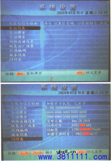 检查发现,采用GK6105S-T+泰和TP5001的奥视通OST168和采用HD3601方案的科海卫星接收机,系统设置中的基站信息缺失(模块版本号显示正常),如图2所示,并且奥视通OST168型“CA信息"是0,如图3所示;科海机器虽然CA信息正常,但按下F4键进入工厂菜单后,提示模块于“OF-FLINE(离线)"状态,如图4所示。