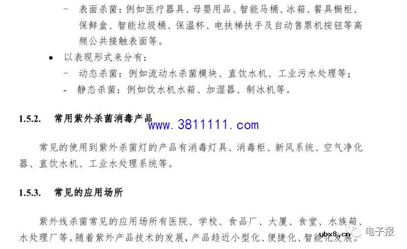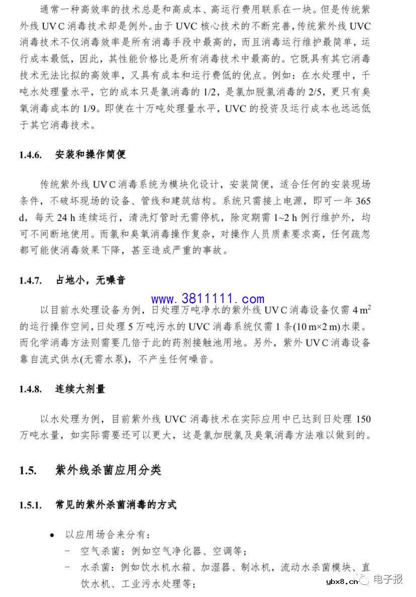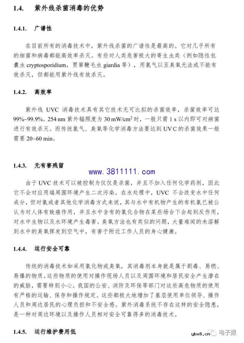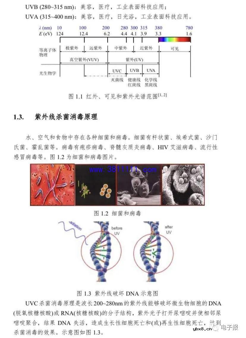 前言 2020年初,一场突如其来的新型冠状病毒疫情肆虐全国。新型冠状病毒感 染的肺炎来势特别凶猛、蔓延特别迅速,已作为急性呼吸道传染病被纳入《中华 人民共和国传染病防治法》规定的乙类传染病,按甲类传染病管理。当前全国上 下团结一致、共同努力,按照“坚定信心、同舟共济、科学防治、精准施策”的要 求全力开展新型冠状病毒疫情的防治工作。 根据国家卫健委发布的《新型冠状病毒感染的肺炎诊疗方案》的描述,新型 冠状病毒属于β属的冠状病毒,有包膜,颗粒呈圆形或椭圆形,常为多形性,直 径60~140 nm。其基因特征与SARS-CoV和MERS-CoV有明显区别。对于冠状 病毒特性的认知多来自对SARS-CoV和MERS-CoV的研究。病毒对于紫外线和 热敏感,56"C 30分钟、乙醚、75%乙醇、含氯消毒剂、过氧乙酸和氯仿等脂溶 剂均可有效灭活病毒,氯已定不能有效灭活病毒。同时新型冠状病毒的传播主要 途径是呼吸道飞沫和接触传播。 正值全民抗击疫情的重要时刻,上海浦东照明智能联合会的全体成员充分发 挥联合会成员特有资源,通过紧密合作把紫外线杀菌消毒的相关科学知识、专业 产品和安全有效应用编制成指南,为政府、社区、医院、企业和家庭等提供较为 全面的资讯,为抗击疫情做出应有的工作和贡献。 《杀菌消毒紫外线光源和灯具应用指南》包含了从紫外线杀菌消毒的原理、 紫外光源研究进展、紫外线杀菌消毒的光源和灯具、紫外线杀菌消毒的应用和注 意事项等八个章节的内容。在防治新型冠状病毒疫情的重要阶段,本指南全面介 绍了怎样设计好、制造好、选择好、使用好、防护好紫外线杀菌消毒产品;全面 介绍了紫外线杀菌消毒产品和使用相关的国家和行业重要标准. 规范和认证要求; 全面分析了紫外线杀菌消毒的相关专利技术;用了很大篇幅阐述了紫外线杀菌消 毒的发展展望,特别介绍了在紫外技术快速发展和互联网和人工智能不断能融合 背景下,紫外线的杀菌消毒功能将会不断满足人们对美好安全生活多样化需求。 上海浦东智能照明联合会特别感积极谢参与指南编制的广大会员及审核专 家,特别感谢负责各章节的主编会员,我们将为打赢抗击新型冠病毒疫情的伟大 战役、为紫外线杀菌消毒技术和产品的不断发展、为人民生命安全和身体健康做 出更加努力的工作。 由于时间仓促,本应用指南难免有细节错误,不足之处望读者提出宝贵建议; 我们一定及时做好修改及完善! 第一章紫外线杀菌消毒原理 1.1. 紫外光源研发和应用简史 大约在1个多世纪以前,人们就开始了对紫外线消毒机理和应用的研究。 1877年,Downs和Blunt 第一次报道了关于太阳光辐射可以杀灭培养基中 细菌的特性,这也揭开了人们对紫外线消毒研究和应用的序幕。 1901年,汞灯开始被用作人造紫外光源。 1903年,丹麦科学家芬森(Niels Ryberg Finsen)因紫外线光疗法治疗皮肤 病获诺贝尔生理学或医学奖。 1904年,Kuch造出了第一个石英管紫外灯。 1910 年,在法国马赛市,紫外线消毒系统第一次被用于城市给水处理的生 产实践中。 1916年,美国建设了第一个紫外线消毒系统。 1938年,美国Westinghouse Elecrice公司展出了第一个基于低气压汞蒸气放 电发出的紫外光激发的荧光灯。 1955年,瑞士和奥地利开始采用紫外线给水消毒的技术。 1999年,国际紫外线协会(International Ultraviolet Association, IUVA) 成 立,在国际上进一步促进了紫外线在各领域中应用技术的研究和交流。 2000年,USEPA颁布的地下水消毒条例(Groundwater Disinfection Rule,简 称"GWDR")正式提到,对于杀灭传统消毒方法不能有效控制的有害病原微生物, 紫外线消毒技术是最佳选择之一。 2002年,紫外LED正式推向商用市场。 1.2.紫外光谱 图1.1为1000000nm光谱波段,可分为红外,可见和紫外区,其波长 范围和主要用途为: 紫外线(UV) 100 400nm:环保,健康,美容,工业工程; 可见光(VIS) 400~780 nm:照明; 红外线(IR) 780- 100000 nm:健康,工业工程。 其中紫外波段可再分为4个区域,其用途为: VUV (100 200 nm):表面处理,产生奥氧,工业水预备; 心电 UVC (200- -280 nm):杀菌,消毒;