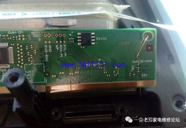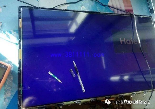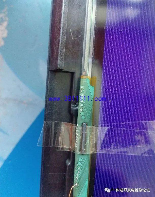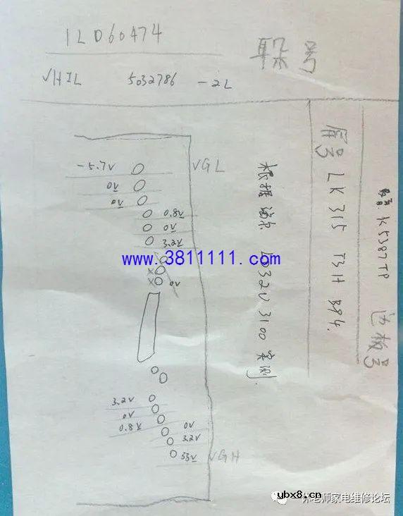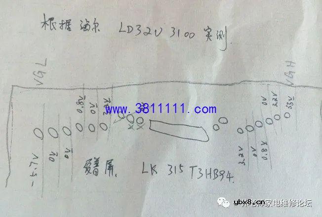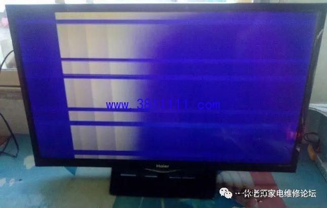 海尔LD32U3100液晶电视看着的时候突然花屏上有横条 接修一台海尔LD32U3100液晶电视,用户说正在家里看着电视的时候突然变成了这样(如下图所示)。开机时有几条竖线,蓝屏出现后,这个故障光栅左右摆动,位置不固定。按遥控静音或音量时,屏幕相应位置有垂直亮竖带干扰。 这台电视用的是夏普屏,型号是LK315T3HB94,拆除液晶边框,在网上查不到这个屏的相关电压方便的资料,于是实测一下电压值(如下图所示),测量完毕再试机发现电视图像居然正常了,因为没拆屏时测得VGH形成电压为38V,现在正常显示时测电压为35V,还是怀疑COF丢失VGH电压,即使有电,也再飞根线“备”着;这台电视接下来能使用多久,本人也不能确定,技术水平有限,请多指教。