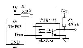 以下为普通光耦隔离电路,TMP03能够承受5MA以下的灌电流,可直接与光耦中LED发光二极管的阻极连通。