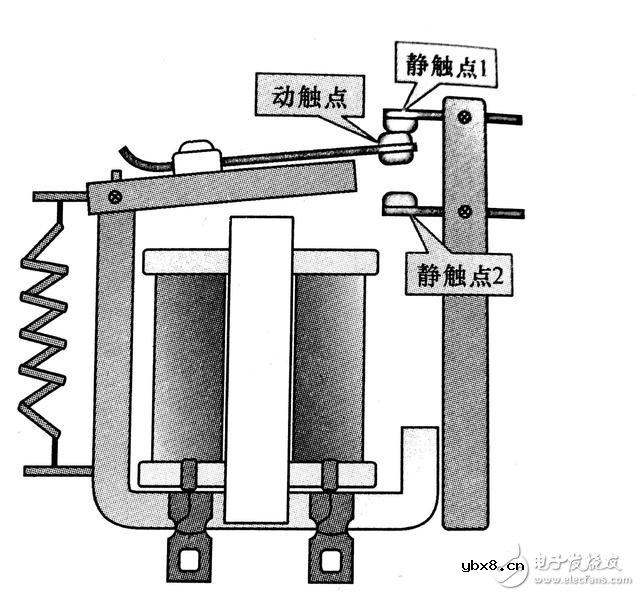 继电器的转换触点是继电器的一个动触点和两个静触点。其中动触点与静触点1处于闭会状态,称为常闭触点,动触点与静触点2处于断开状态,称为常开触点,如下图所示。