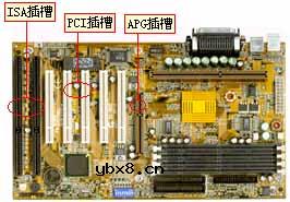 安装显示卡、声卡 第八步,安装显示卡和声卡:主板上黑色槽是ISA插槽,白色插槽是PCI槽,还有这一个是AGP插槽,专门用来插AGP显示卡的。