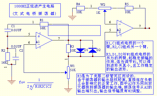 1KHZ正弦波产生电路(文氏电桥振荡器) R3是为了克服二极管死区而设的.由于振荡器的输出阻抗较高,直接连在负载上会影响振荡器的正常工作.图中A2作为同向放大器接到振荡器的输出端,振荡信号从A2输出端引出,输出信号幅