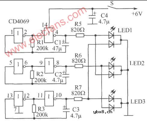 小玩具电路 如图所示为一种有趣的小玩具电路。合上电源开关后,3只小彩灯会随机发出红、绿、橙色。电路主要由六反相器CD4069数字集成电路与3只变色发光二极管等元器件构成。