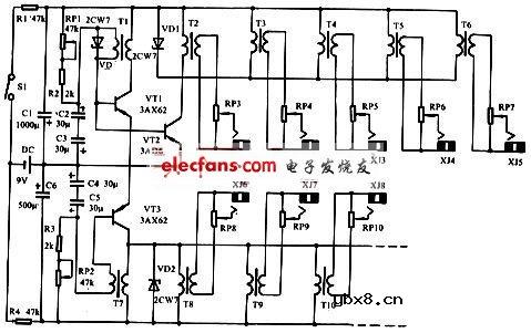 工作原理:电子麻醉器电路如下图所示,由于晶体管振荡器基本上是一个恒流源,所以在同时二组以上的输出时(如四组),若一组输出幅度大点,则另外的几组负脉冲部分输出就相应的要减少。这也就是说它们会互相影响。这