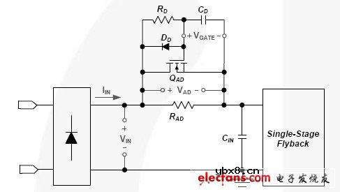 有源阻尼电路原理图中RAD 为有源阻尼电阻,QAD为有源MOSFET,用以降低RAD的功耗。RD 和 CD 为延时电路元件。DD 为复位二极管,用于泄放CD。