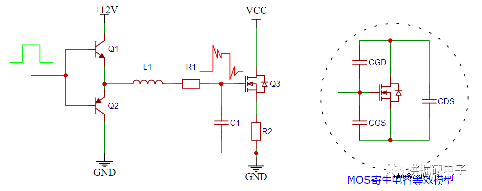在驱动MOS管时,我们希望给到MOS管栅极是标准的电压方波波形,但是在实际情况下,我们在测得的Ugs波形往往是带有振荡的。这种振荡波形会在电路线路上产生额外的噪声干扰,还造成不必要的功率损耗。